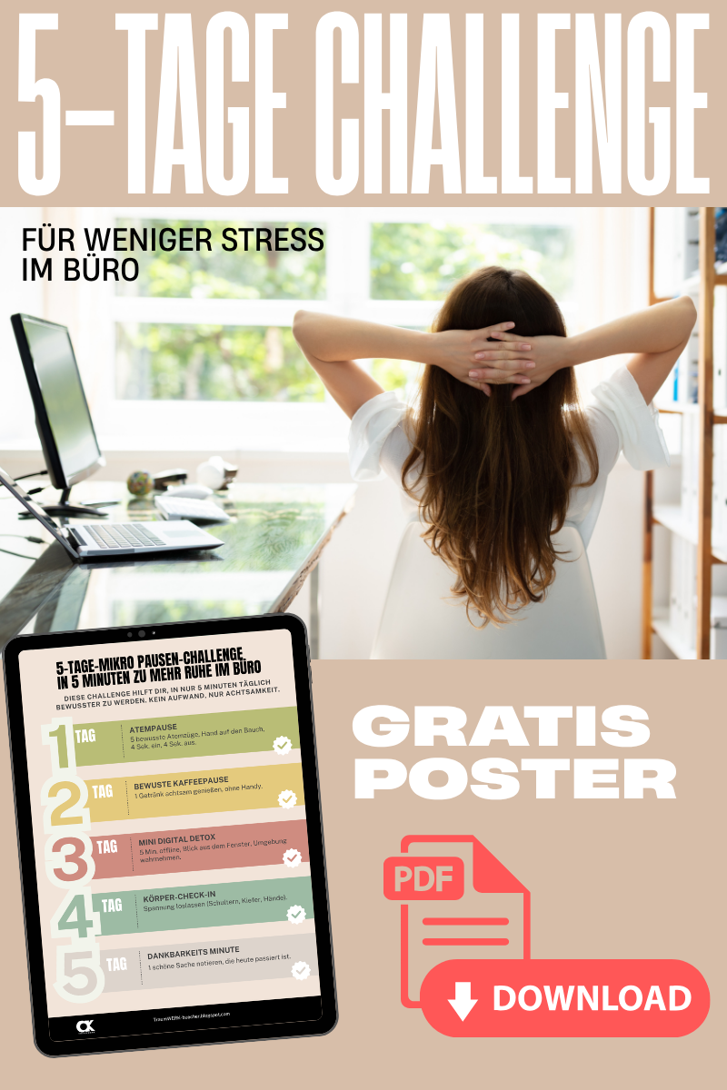 Das 5-Tage-Mikro-Pausen-Challenge Poster für mehr Ruhe im Büro! Gleich aufhängen für mehr Achtsamkeit im Bürostress!